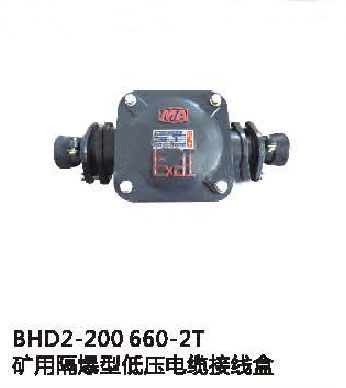 BHD2系列矿用隔爆型电缆接线盒适用于具有甲烷、煤尘等爆炸性气体混合物的煤矿井下,分别供交流50Hz,电压1140V及以下,电流400A及以下的供电系统中作照明、信号、动力电缆连接和分支之用。